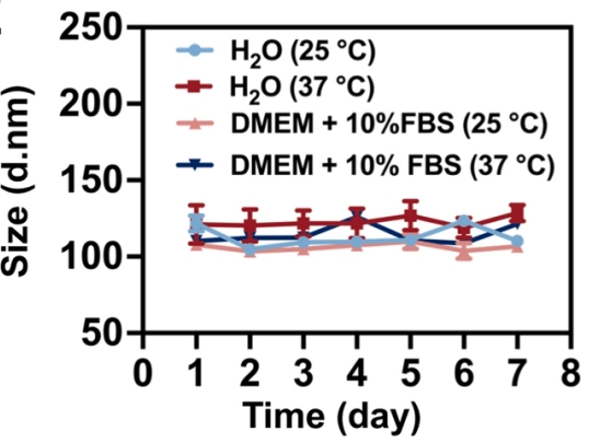 研究者还通过测试不同温度(25℃和37℃)、不同分散剂(纯水和杜氏改良Eagle培养基+10%胎牛血清)条件下米诺地尔颗粒的粒径变化来进一步探究它的稳定性。从下图可以看出,在不同温度下,无论是在纯水还是杜氏改良Eagle培养基+10%胎牛血清中,该颗粒都体现出良好的稳定性,可以保存至少一周。
