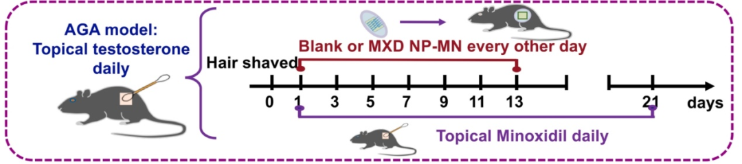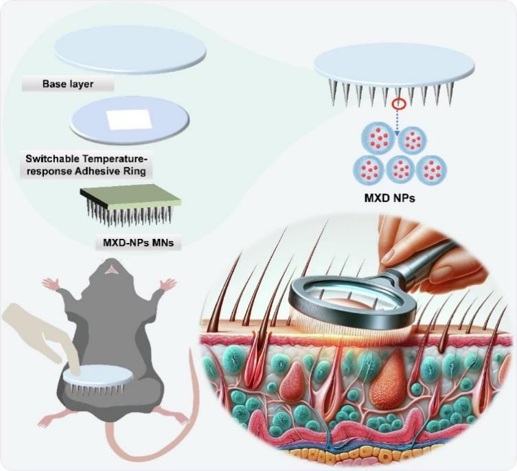 那可不可以通过直接在头皮表层注射药物,使药物直达毛囊来提高药效呢?答案是肯定的!一篇题为“Temperature-responsive detachable microneedles integrated with minoxidil nanoparticle for effectively promoting hair regrowth” 的文章就给出了一个很好的解决方案。由中山大学第八附属医院和上海交通大学共同完成的一项研究提出了一种创新性药物传递方法——通过温度响应的可分离微针,将米诺地尔纳米颗粒直接传递至毛囊深层,有效促进毛发再生。与传统的外用米诺地尔相比,这种微针传递系统的优势在于可以更高效地将药物渗透到皮肤深层,避免了传统外用药物无法深入毛囊的问题。此外,温度响应机制使微针在与人体接触后逐渐释放药物,无需频繁施药,减少了副作用的产生。