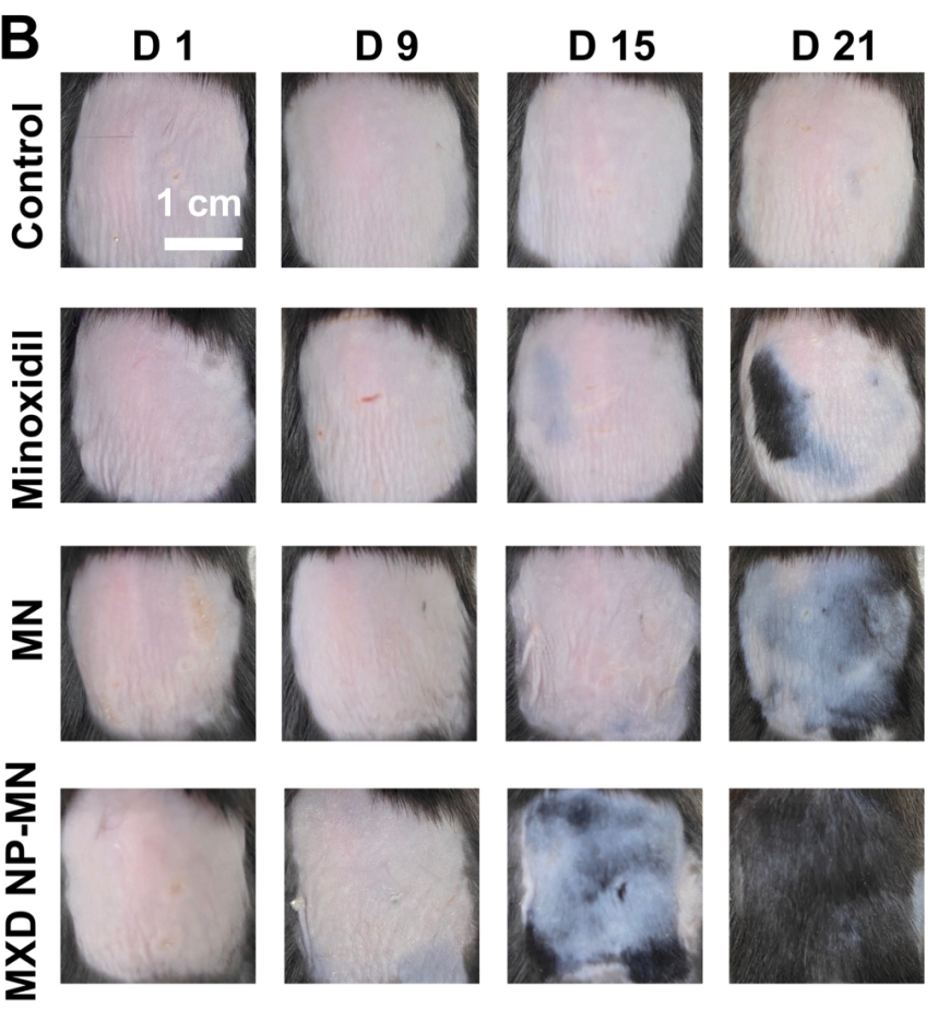 上图是利用雄性激素使小白鼠变秃后,用新型的给药方案(采用温度响应机制微针每隔一天给药,13天一共7次)和普通的表面涂抹方案(每天涂抹,一共21天)的示意图。下图则是空白对照组、表面涂抹米诺地尔组、空白微针组和封装有米诺地尔药物的微针组的小鼠毛发再生的特征性照片,我们可以明显的观察到治疗3周后,除了空白对照组外各组均观察到毛发再生,表明模型建立成功。与空白微针组和表面涂抹米诺地尔组相比,封装有米诺地尔药物的微针组处理小鼠的毛囊在第15天首先完成从休止期到生长期的转变,并在第21天最终从毛囊中长出毛发!