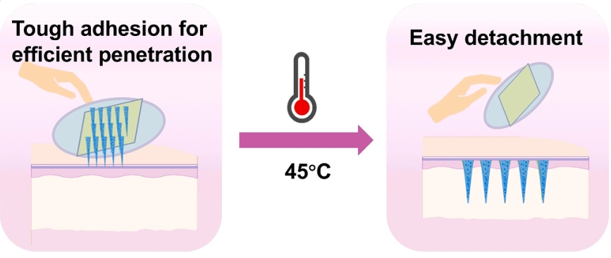 这项研究中的温度响应微针是由一种可降解的聚合物制成,该聚合物在人体温度(通常约为37°C)下开始溶解。微针插入皮肤后,受到人体体温的影响,温敏材料会开始逐渐降解,从而释放出其中的药物。与传统外用药物不同的是,这种温度响应的微针系统能够在控制药物释放速度的同时,保证药物直达毛囊,更深入地刺激毛发生长。为了避免一些常见的粘附层,比如说绷带、医用防护织物对我们脆弱的表皮层造成二次伤害,研究者设计了一种可以随着温度升高而降低其粘附性的水凝胶,图2就是这种水凝胶的工作示意图,当温度提高到45℃时,水凝胶粘附性降低,这样就可以轻松剥离粘附层,只留微针在表皮层。